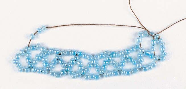 Gently spread the loop with your fingers to form a small triangle. For the next element, you’ll only need 6 beads. String these beads and pass the thread through the corner bead of the previous element. This will connect the new element and let your pattern start to grow.