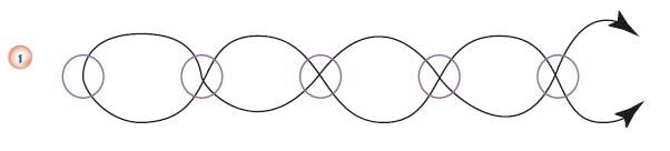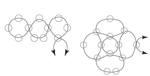 This technique is used only in monastic weaving. A strap (bend) is created by pulling together parallel beads using fishing line, followed by fixation to form a controlled bend. In the diagrams, the tightening points are marked with a red arc with arrows on both sides.