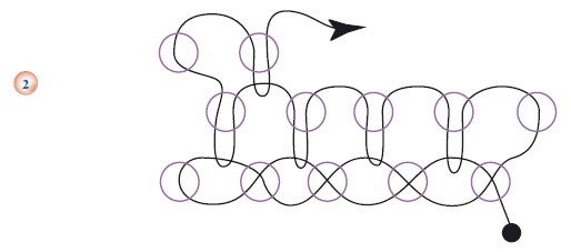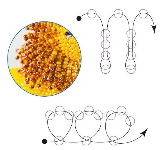 To perform this decrease, continue weaving the row to the specified point in the diagram without weaving the last bead of the row. Return the thread to the last bead added and continue weaving in the opposite direction. In the same way, turn the direction of weaving before reaching the end on the opposite side. By gradually reducing the number of beads woven from each edge, a neat corner is formed.
